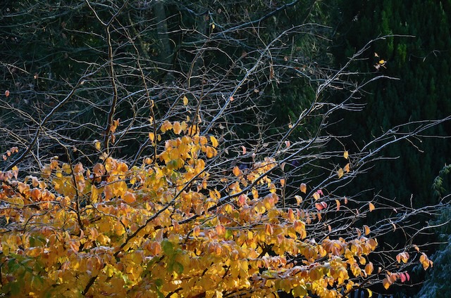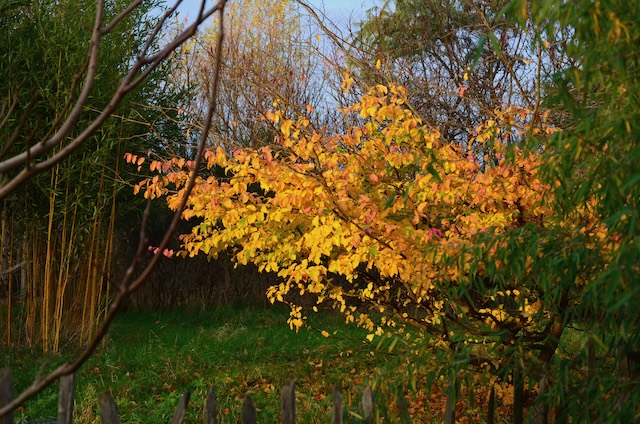 Am Monatsanfang gab es einige Sonnenstunden, die das bunte Herbstlaub zum Strahlen brachten. Das Persische Eisenholz (Parrotia persica) ist wie jedes Jahr ein besonderer Blickfang