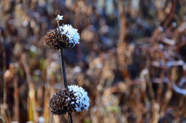 An einigen Stellen konnte die Sonne im Laufe des Tages mit ihrer Kraft noch den Raureif zum Schmelzen bringen – mit grafisch spannenden Effekten wie hier an den Blütenständen des Brandkrauts (Phlomis russeliana)