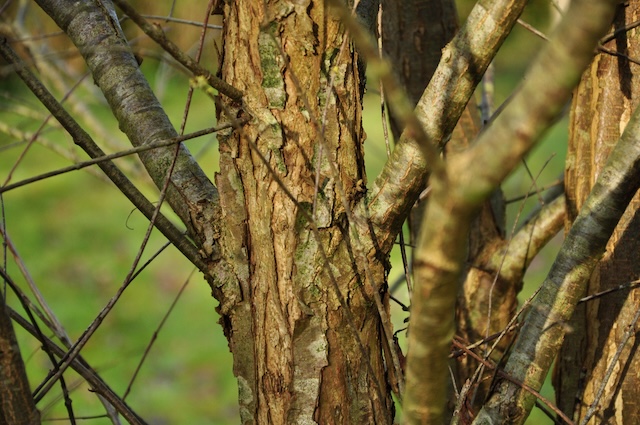 Längsrissige graubraune Borke beim Katsurabaum (Cercidiphyllum japonicum)
