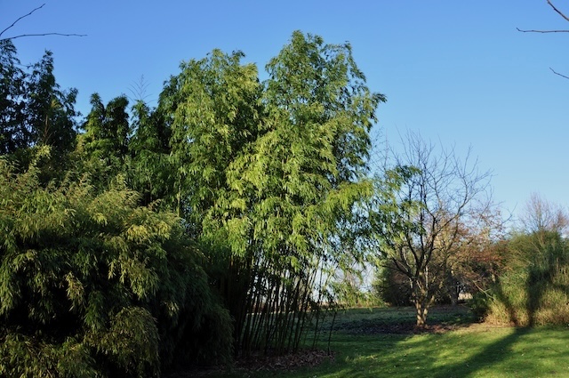 Wenn das bunte Herbstlaub von den allermeisten Bäumen am Boden liegt, bringt Bambus mit seinen frischgrünen Blättern und den farbenfrohen Halmen optisch einen echten Gewinn, wie die in der Sonne leuchtenden dottergelben Halme von Phyllostachys aureosulcata ‚Spectabilis‘ hier zeigen. Auch die Vögel profitieren von dem immergrünen Riesengras: So verbringt unsere Haussperlingsschar jede Nacht in zwei großen Bambushorsten neben unserer Garage – abends begleitet von einem lauten Spektakel, bis jeder Vogel seinen Platz gefunden hat. Andere Singvögel nutzen die Haine ebenfalls als sicheren Schlafplatz